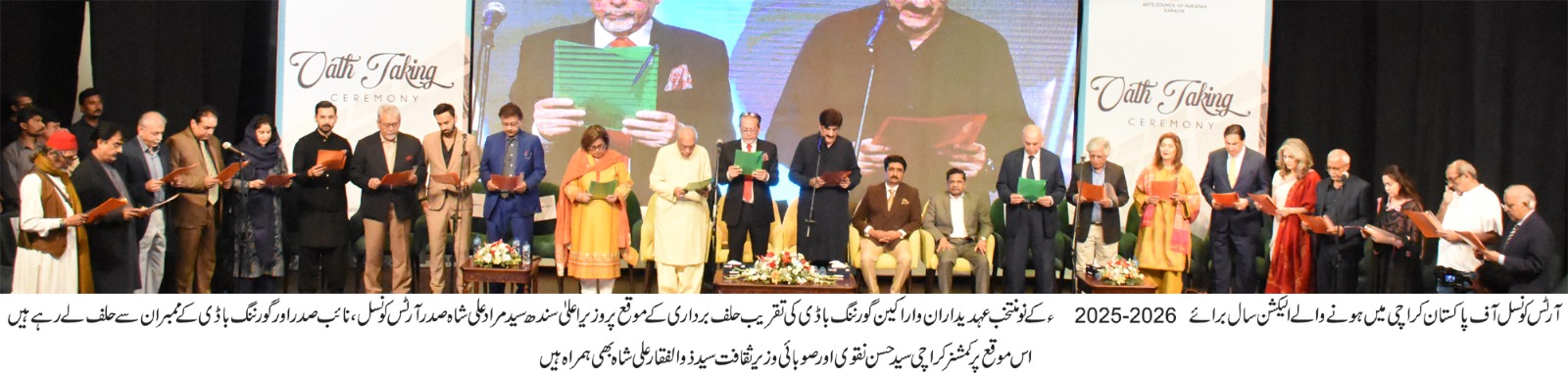 تقریب کا آغاز تلاوت قرآن اور قومی ترانے سے کیا گیا، آرٹس کونسل آف پاکستان کراچی کے الیکشن سال برائے 26-2025ءکے لیے کامیاب ہونے والے نومنتخب عہدیداران و اراکین گورننگ باڈی سے وزیراعلیٰ سندھ سید مراد علی شاہ نے حلف لیا جس میں محمد احمد شاہ (صدر)، منور سعید (نائب صدر)، پروفیسر اعجاز احمد فاروقی (سیکریٹری) اور نورالہدیٰ شاہ (جوائنٹ سیکریٹری) سمیت اراکین گورننگ باڈی میں شامل ڈاکٹر ہما میر، ڈاکٹر ایس ایم قیصر سجاد ، محمد اقبال لطیف ، ڈاکٹر عنبریں حسیب عنبر، غازی صلاح الدین ، سید ساجد حسن، محمد ایوب شیخ ، اخلاق احمد خان ، امجد حسین شاہ ، عبداللہ سلطان، فرخ تنویر شہاب ، ڈاکٹر امجد سراج میمن، ڈاکٹر جعفر احمد ، عالیہ اقبال نقوی، وسیم بادامی ، چاند گل شاہ اور غوث اکبر نے حلف اٹھایا۔