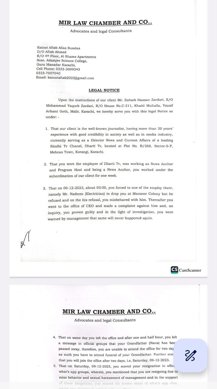 میر لا چیمبر اینڈ کمپنی کی جانب سے دائر قانونی نوٹس میں زوہیب زرداری نے موقف اختیار کیا کہ سابقہ نیوز کاسٹر نے ان پر من گھڑت الزامات لگاتے لگاتے ہوئے سوشل میڈیا پر جعلی اسکرین شاٹس شیئر کرکے میری ساکھ متاثر کی گئی ہے۔